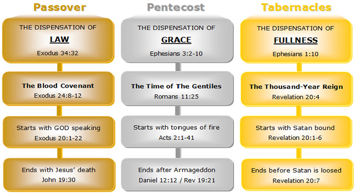I have heard it taught in the past that as one of the major dispensations above passes away and the next one comes forth, that somehow those dispensations can and do "meld together" or "overlap" as they say. Now it's true that some of the minor dispensations (judges, kings, prophets, etc.) did run concurrently with other dispensations, especially with the dispensation of the Law. Howbeit, spiritually speaking there is a certain aspect of that thinking that is correct because people's hearts and minds don't always keep up with GOD'S appointed times. Furthermore, the Bible does teach us that things are brought forth in the spiritual (heavenly) realm, before they come forth in the natural (earthly) realm. However, those principles—although true—are another matter altogether, and we want to compare apples to apples here. That is why this teaching will focus more on the last three major feast days and their corresponding dispensations as found in the Bible.